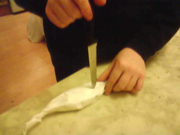 tist abierto final aproximadamente 2 pulgadas para incluir la comida. luego hacer un pequeño agujero en un extremo con una herramienta apropiada eg.a skrewdriver o un objeto puntiagudo, (pero cuidado) para empezar el pájaro.