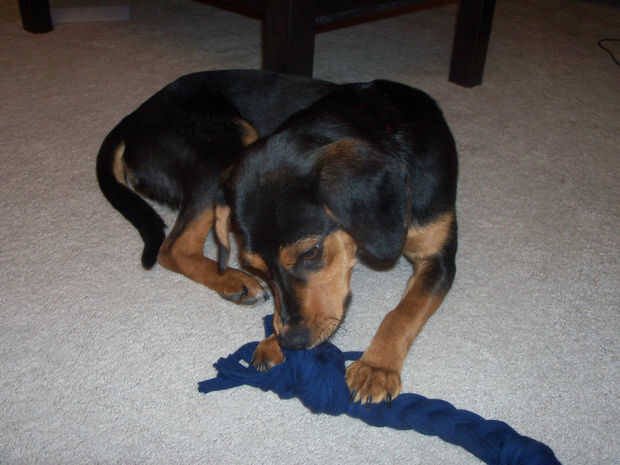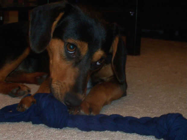 después de conseguir un cachorro, empecé a hacer a su perro juguetes de cuerda. Este juguete tiene una larga cola que es ideal para hacer pivotar alrededor para lanzar para fetch, o para jugar tug-a-guerra. En el parque para perros alguien tenía llam