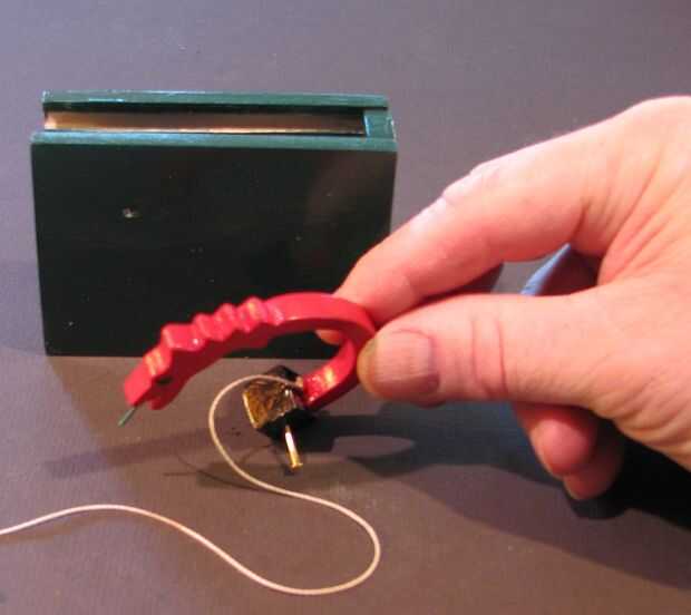 Ahora golpee la cabeza del clavo (no conducir en todavía) para que el nail'spoint se fija temporalmente en la parte inferior lateral. Establecer los peces vertical, caja la cadena fuera de la caja de tragante abierto y comprobar la acción de la figura del dragón tirando suavemente de la cadena para elevar la figura hacia arriba y hacia abajo. La figura debe estar centrada aproximadamente en la caja como sale; Si se inclina mal una u otra manera, coloque la caja hacia abajo, tire punto del clavo y ajustar su ubicación un poco. Esto es más fácil de hacer que se describe!