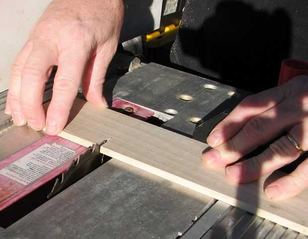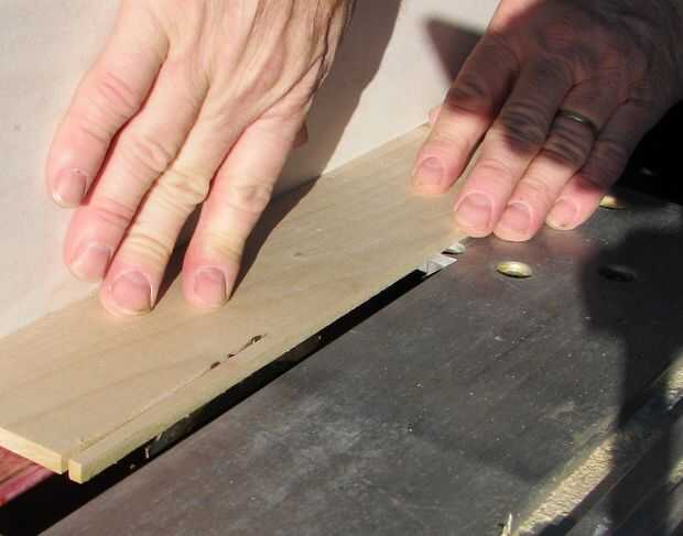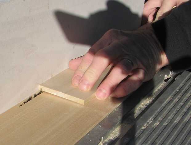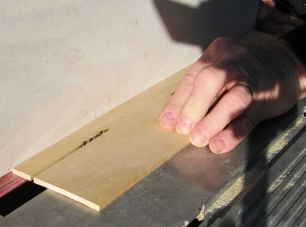 Ahora corte una 1/8" de profundidad x + 1/8" barbilla amplia a lo largo de una cara larga de un lado, establecer la barbilla de nuevo 1/8" del borde del lado . Repita con el segundo lado. El "+ 1/8" dimensión indica un ancho ligeramente mayor que 1/8"; prueba los rebajos para ver que la pieza de la corredera se deslizará fácilmente a lo largo de los rebajos.
