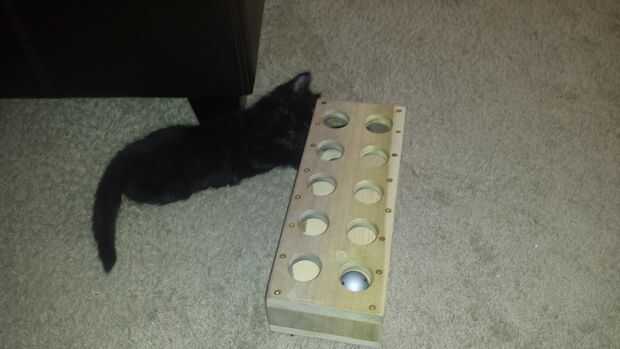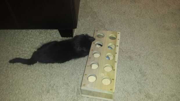 Una vez completado, me di cuenta que vería un poco en él, pero todavía realmente no comprendía lo que él debía hacer. Nuestros mayores cat un ratter campeón. Calcular se aprovecharía de los instintos naturales de los gatos. He pintado el color gris "rata" de bolas de ping pong y dibujó negro "ojo" mirando círculos utilizando un rotulador. Había originalmente dejé blanco. Seriamente, el gris con círculos negros realmente despertaron su curiosidad. Ahora juega con esta cosa, dentro y fuera todo el día. Un par de otros toques debían usar un enrutador para suavizar los bordes de los agujeros y forre el fondo de la misma con fieltro para asegurarse de que no rayar nada. Utilicé tornillos para poner juntos. Probablemente podría utilizar una pistola de clavos y la velocidad de este. No quería que los lados girando más adelante. Además se ve un poco más "pro". Si tienes un gato, le recomiendo que darle a éste un tiro. Va a encantar.