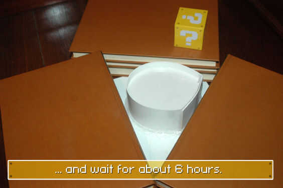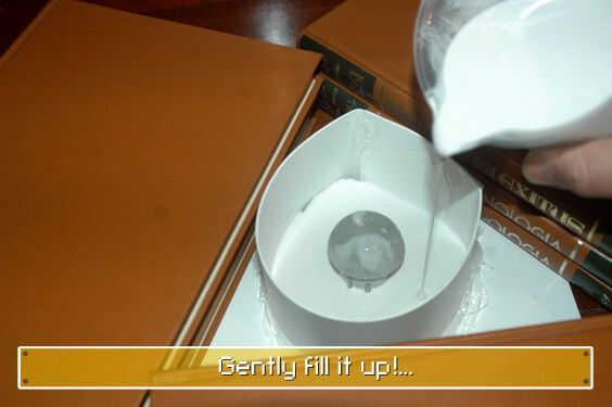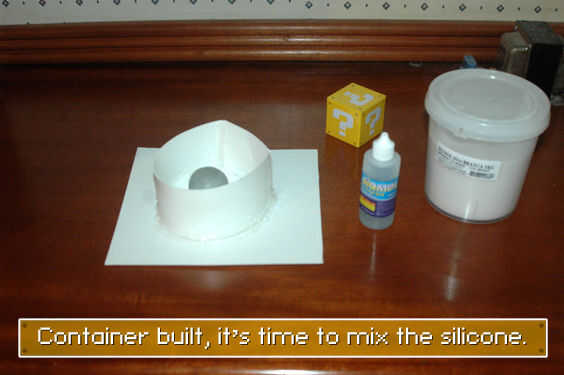 Cinta (o arreglarlo de otra manera, he utilizado algunos libros) el recipiente y la base sobre una superficie plana y nivelada. Asegúrese de que es realmente robusto y plano. Utilice un palillo del pegamento para pegar el modelo en la parte inferior del envase. Asegúrese de que es bien centrada para que la silicona se extiende uniformemente alrededor de él.