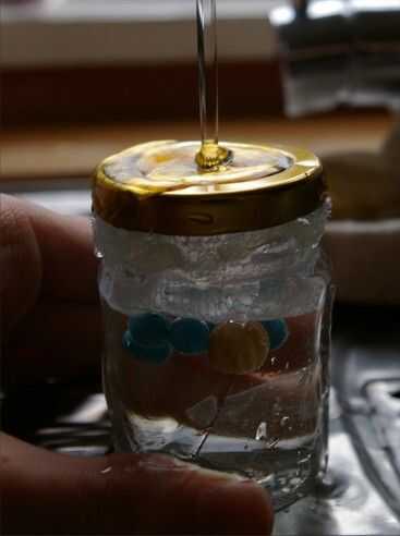 Ha llegado el momento de llenarlo con agua! Vierta el agua en el agujero de la tapa y deje que se llene completamente. Si ves alguna fuga, probar y llenarlos con pegamento caliente. Como veis, los granos flotarán probablemente al principio. Esto puede ser de dos razones: lo más probable; que hay aire atrapado en el agujero donde la cadena atraviesa normalmente. Esto se debe resolver si agitas por un poco.