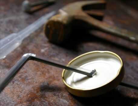 Martillo el clavo grande través la tapa sobre una superficie dura, a continuación, tire de ella hacia fuera. Consulte con la paja si cabe por el agujero. Tenga cuidado de no doblar la tapa para que no enrosque en, sería precioso.