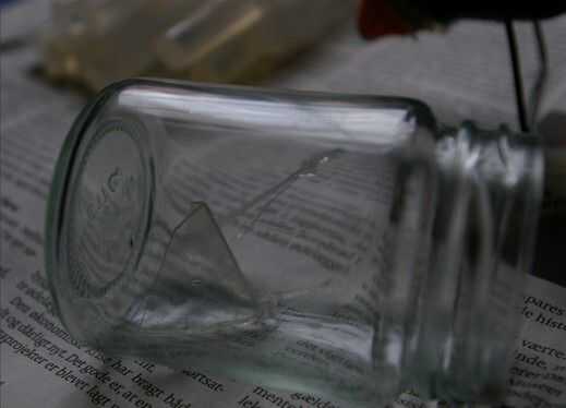 Aplique pegamento caliente alrededor de un borde. Creo que antes de que pegue! Imaginar cómo se va a colocar así que usted puede averiguar dónde poner el pegamento. Luego, pegar cuidadosamente el aro al interior de la jarra, cerca de la cima pero no demasiado cerca, los granos tienen que ser capaz de entrar. Recuerde que la jarra va a estar boca abajo cuando hemos terminado. Si usted comete un error o pegamento en los lugares equivocados, espere hasta que se haya secado (10 segundos para la mayoría de pistolas de pegamento) y tire con cuidado de.