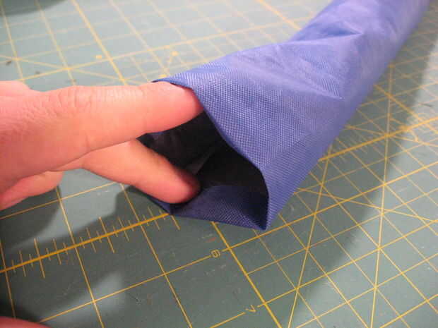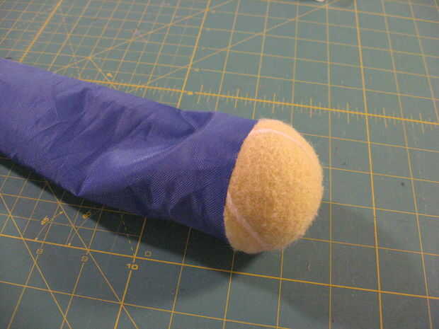 En el extremo abierto de la cola, dobla la pulgada superior o tan abajo en la sección de cola y Coloque suavemente la bola en la apertura. Cuidadosamente levante a la tela sobre la pelota de tenis un poco a la vez, trabajando su manera alrededor de la bola. Debe ser agradable y cómodo. No desea que la cola para cubrir más de la mitad de la pelota de tenis.