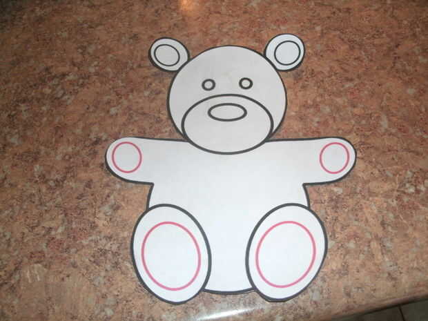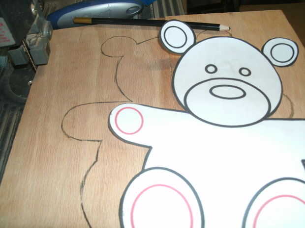 En este paso tienes que hacer dos cosas. El primero es recortar la plantilla del oso que usted debe de impreso hacia fuera. Lo segundo es que necesita trazar el contorno del oso a la madera para que tenga una línea limpia para corte en.