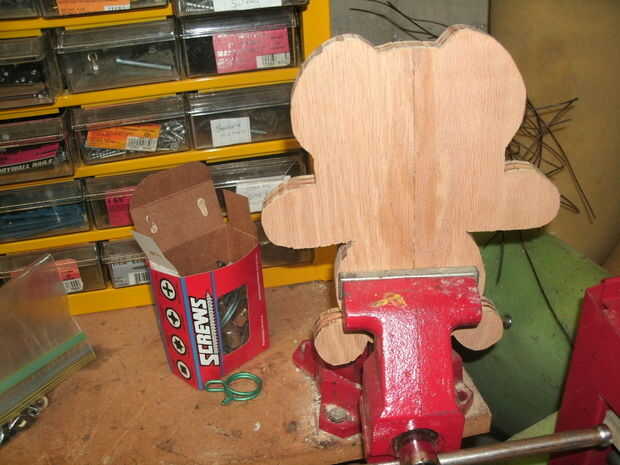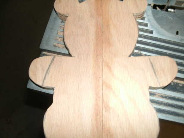 Para este paso necesita su broca y taladro. Necesita marcar sobre 45 º en los brazos de los osos, por lo que se pueden taladrar los agujeros para la cuerda. Se debe utilizar una broca de no más grande que el tamaño de la cuerda que usas para que forma el oso no es libremente colgando de las cuerdas. Pongo mi oso en un tornillo de banco por lo que puedo perforar un agujero recto sin la madera deslizando hacia fuera de debajo de mí.