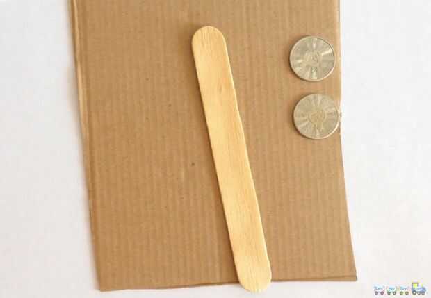 Materiales• 2 pedazos de cartón rígido (aproximadamente 6 x 6 cm)• una perforadora o tijeras• cinta de• 1 banda elástica (unos 8 cm de largo)• 1 palillo fuerte (o palo de fósforo o helado)Paso 1.Hacer agujeros cuadrados de cartulina intwo con una per