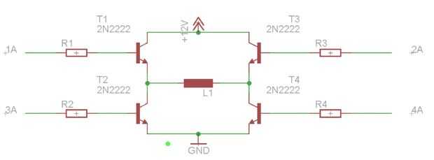 Conductor, hacer circuito tales como transistores y resistencias sigue. Si tienes otro circuito controlador de motor puede utilizar. Hacer el siguiente circuito tanto como dos. A los motores izquierdos y derecho. Conectar puntos 1A-4A arriba con 1A-4A en el circuito siguiente. L1 es de motor CC.