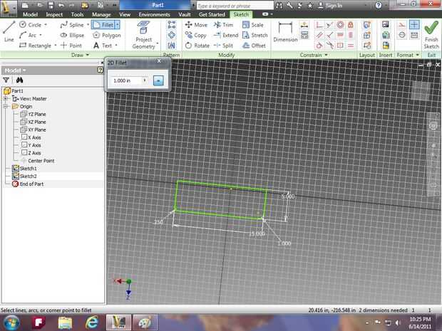 Imagen tres: crear algunos filetes de 2D en las esquinas usando el filete herramienta y selección de dos lados del rectángulo y haga clic en finish sketch.