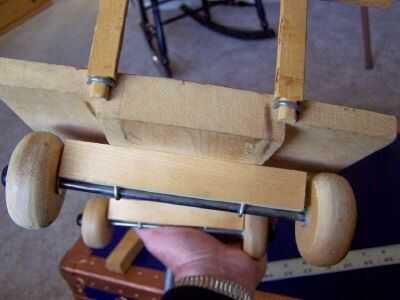 pegué tres piezas de abedul junto y utiliza un cepillo rotatorio en mi brazo radial Sierra para que la parte exterior más delgado que el centro.  Puedes ver las grapas que utiliza para detener el carro vertical extraíble en lugar.  El carro de la rueda trasera se pega en la parte inferior de la carreta.  Tenga en cuenta las arandelas de acero entre las ruedas y el transporte.