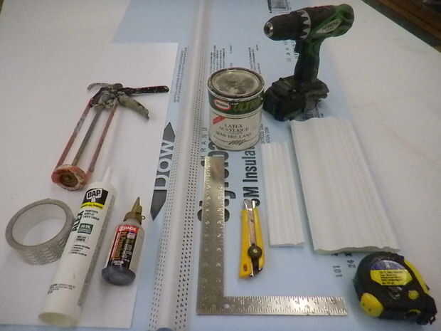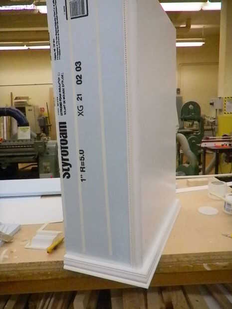 2. las esquinas de la espuma fueron routered en una mesa de fresadora, así que encajaría en el reborde de esquina de yeso plástico sobre los bordes. Los paneles individuales se llevan a cabo con cinta de doble cara. Las esquinas se llevan a cabo en la misma forma,