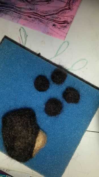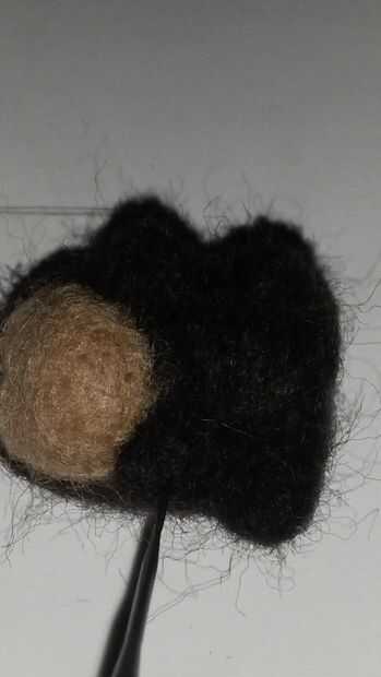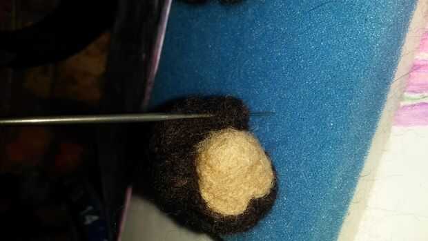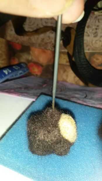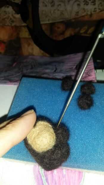 Sentía cada bola con su aguja corona. Enróllelo y apuñalar a él, todas las direcciones. La tercera foto muestra como se ven después de ser de fieltro un poco con la aguja de punto de la corona. No sentí mucho, sobre todo desea virar las fibras dentro de una esfera para que sean fáciles de gestionar, todavía dejando algunos trozos sueltos.