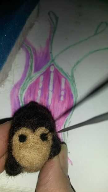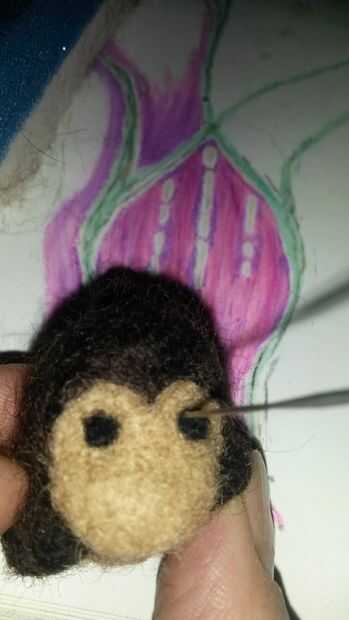 A continuación tienes que fijar a la cara. Utilice su aguja de punto de la estrella para recoger la pieza y luego la puñalada en el centro como se muestra en la segunda foto. Trabajo luego hacia fuera desde el centro de fieltrar la lana negra en el enfoque superficial en el borde otra vez, que desea insertar la aguja derecha donde un color se encuentra con el otro para que medio las barbas de agujas están cogiendo un color y mitad es coger el otro. Esto se ve en la tercera foto.