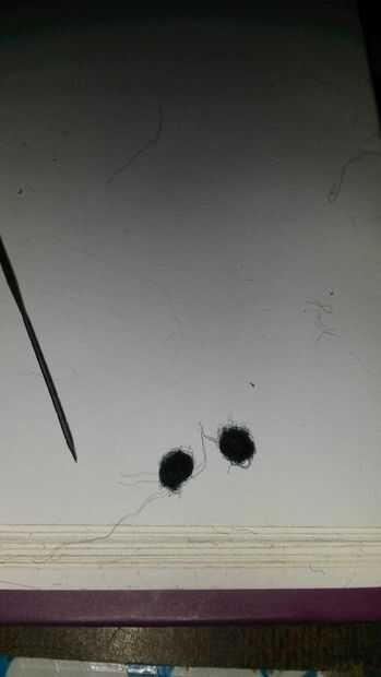 Usted quiere tomar lo mejor 5-10 pelos sueltos de lana negra. Literalmente una muy pequeña cantidad de fibra y rodillo entre el dedo consejos para convertirlos en bolitas, como se puede ver estos no son grandes en comparación con la aguja.