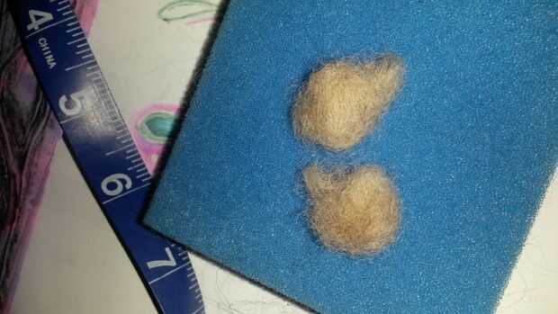 Enrolle las fibras en dos esferas y luego aplastar plana. Puede sentirles un poco antes de adjuntarlos. Al igual que usted de fieltro las orejas antes, sólo se centran en felting el centro y dejando los bordes tipo de sueltas.