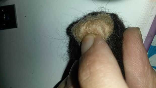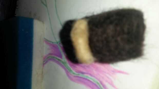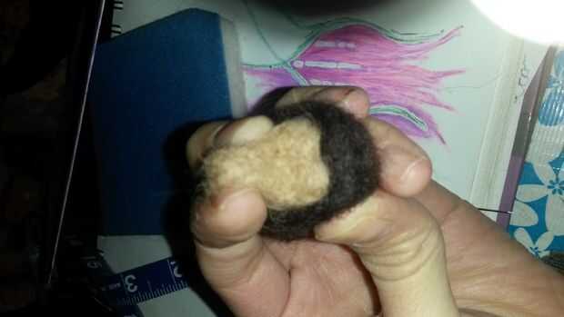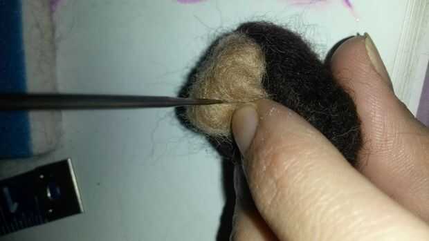 Para moldear la nariz vas a tomar las fibras sueltas al final, se muestra desde abajo para arriba en la primera foto. Entonces está va a pellizcar luego por los lados en dirección al centro, se muestra en la segunda foto. Entonces al final que es floja y pegarse los dedos vas a agarrar y dóblela hacia abajo y debajo. Si nos fijamos en la tercera foto estoy usando mi dedo para sostener esta laminado en fibra en su lugar antes de conectar con mi aguja en el cuerpo, que busca en la parte inferior de la cara...