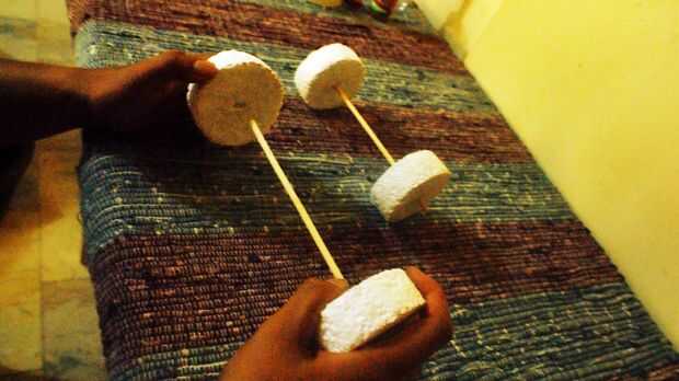 Pegar dos styrofoams circulares en cada uno de los palillos de barbacoa.