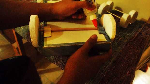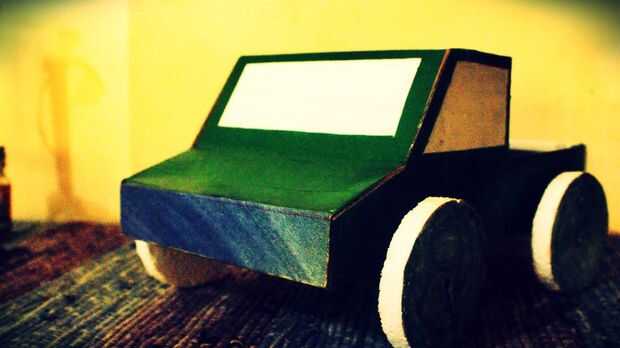 Cortar alguna parte de la caja para hacer 4 cerraduras para sus neumáticos entonces a cubrir la caja con su color preferido usando papel de arte.