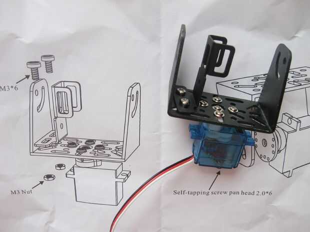 Este soporte está montado con dos de 3 x 6mm rosca tornillos y dos tuercas de 3mm. Deja estas tuercas ligeramente sueltas en esta etapa para que el soporte se puede mover hacia delante y hacia atrás ligeramente. Se apriételos una vez que el servo quede alineado.