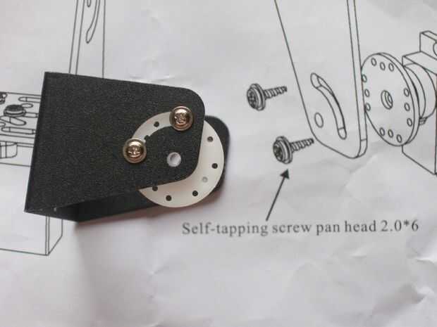 Utilice dos tornillos cabeza de 2 x 6mm para conectar un cuerno redondo servo para el soporte de inclinación. Agujeros de uso que el orificio central del cuerno del servo para alinear con el soporte como se muestra sin permitir demasiado jugar si soltarse los tornillos.