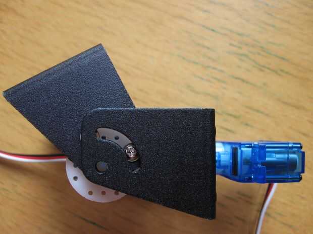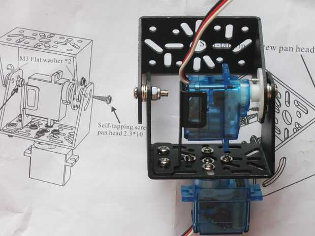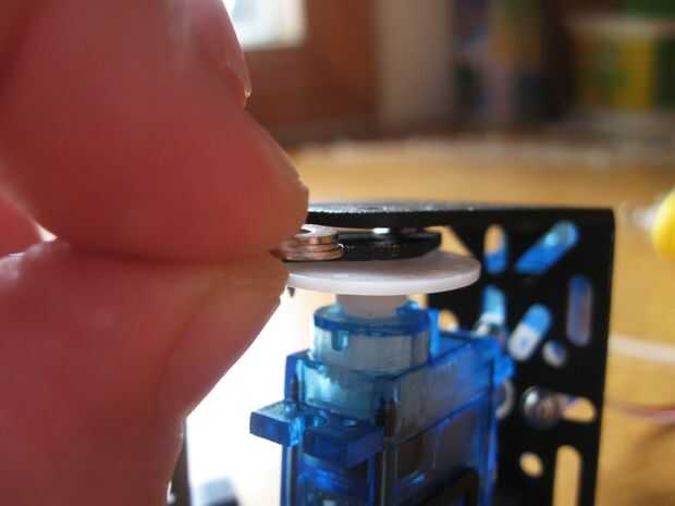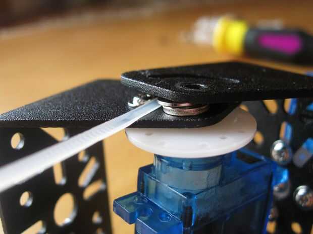 Utilizar una sujeción de cable plástico para empujar suavemente las arandelas en posición como se muestra en la tercera foto. Una vez alinean los orificios son fácil de insertar el tornillo de 2.3 x 10mm a través de los soportes y las arandelas en el eje de salida del servo.