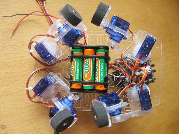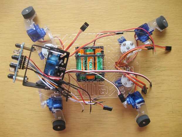 portapilas 2 x 3 celdas son bastante comunes y son lo suficientemente pequeños para caber entre las piernas del robot. Colocar algunas cintas en los extremos de los cables antes de que comience para que no se corta hacia fuera antes de conectarlos y luego instalar 6 x baterías completamente cargadas.