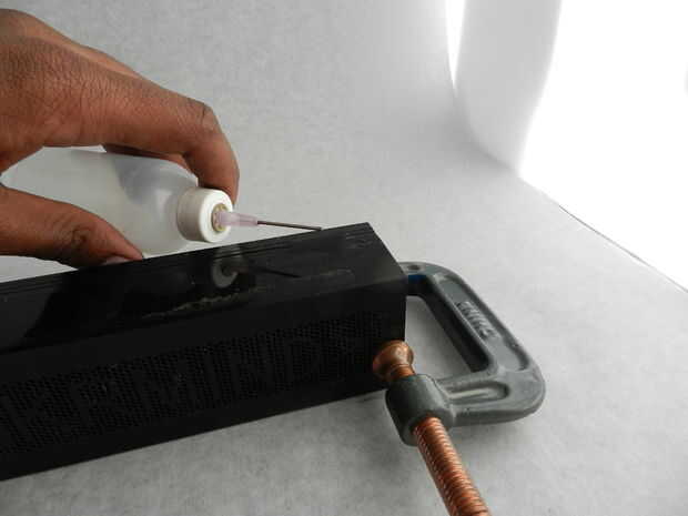 Fije las piezas superior e inferior y utilizar una cantidad generosa de cemento acrílico para unir los dos. En este punto hemos terminado técnicamente, pero odio el final del lustre, así que vamos a remediar eso.