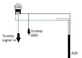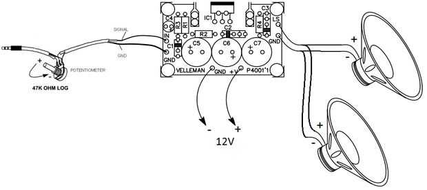 La soldadura de los cables de los altavoces de 8 ohmios juntos (a menos que quieras estéreo, que no sentía que era necesario para este proyecto y requeriría más piezas/pasos) y luego directamente en el amplificador de Velleman como se muestra en el diagrama. La soldadura de la gnd(black) de micro usb a la gnd de la fuente de 5V y el VCC(red) a la fuente de 5V +. Empalme cable de Aux y tie los dos canales juntos y soldadura el potenciómetro (ver diagrama) de la soldadura conduce entre amp y el potenciómetro como se ve en el diagrama. Finalmente, fije energía al amplificador como se ve en el diagrama.