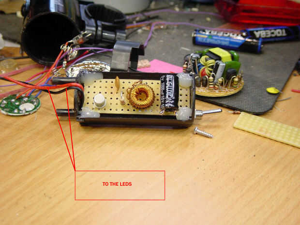 En este paso de la soldadura de cables en tablero de j.t. para los leds, poner la placa en el soporte y fijar con unas gotas de cola derretida. Como se puede ver en las fotos he soldado los cables de la batería y el interruptor en la parte inferior del circuito de j.t., porque hice la Junta muy ajustado ajuste en el soporte así que hay no hay lugar para los cables.