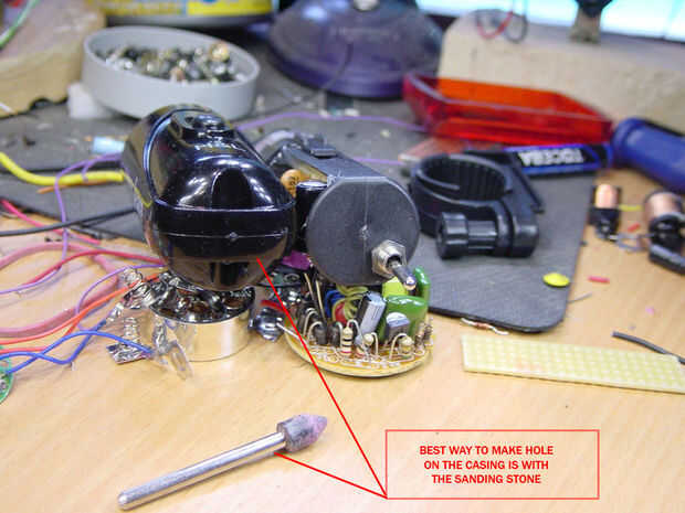 No hay ningún método preciso para elegir lugar para el agujero, después de hacer unas lámparas que probablemente los harán en el lugar correcto (desde mi experiencia). Incluso si se olvida un poco siempre puede reparar con una pequeña lima redonda o lijar piedra ya ha utilizado para hacer el agujero.