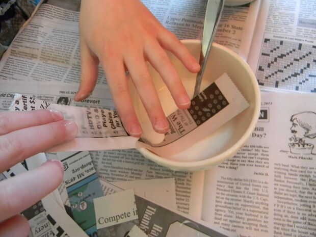 Mezcle una botella de pegamento con 1/3 taza de agua tibia. Luego sumerja cada tira en la cola y frote cualquier exceso de pegamento en el lado de la taza.