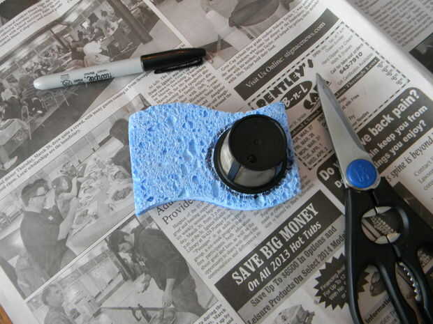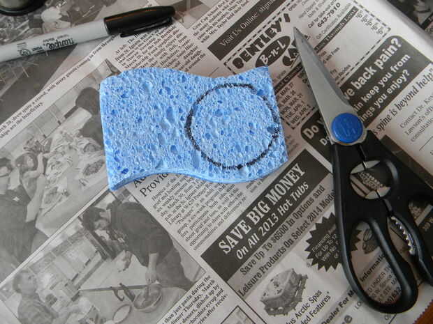 Reece decidido en plata pokadots en su huevo azul brillante así que encontró una esponja limpia y trazó un círculo sobre ella.  Utilicé mi filtro de Keurig :)  Fue apenas el tamaño correcto.