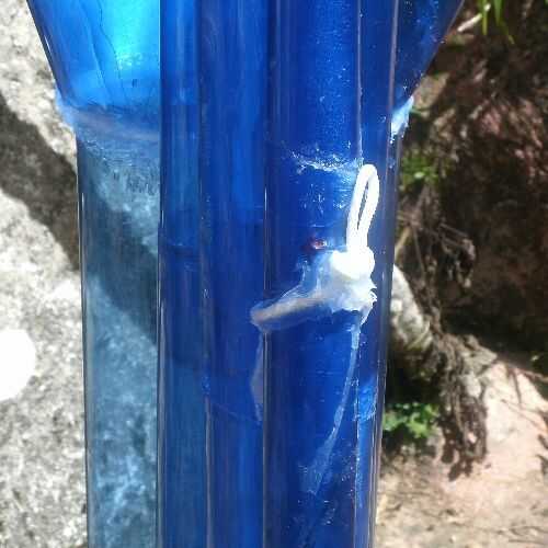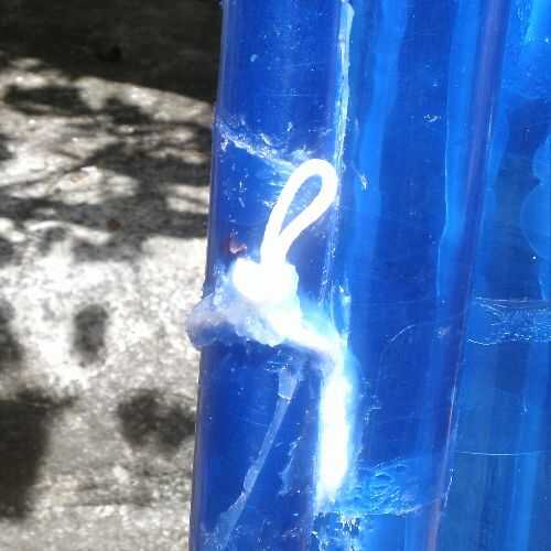 He encontrado un punto de enganche adecuado que deje que el instrumento cuelgue lo que quería y poner un nylon cuerda lazo en ese momento para atar a con la correa. El bucle se une sólo por desgaste de los extremos de la cuerda y trabajando las fibras sueltas en un lío enredado dentro de la silicona. Así, la cadena no puede salir de la silicona. Y como dije, silicona pega como loco a este plástico de rayos x.