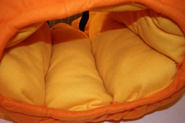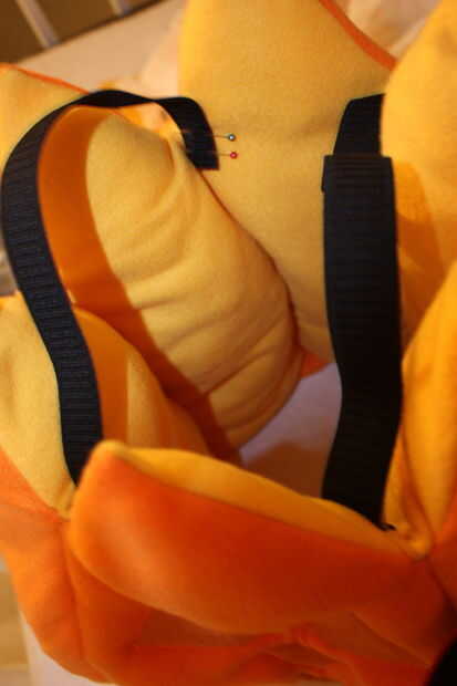 A continuación, para el interior, cortar una pieza rectangular de tela amarilla para caber dentro de en el vientre del niño y mano coser en los costados de la calabaza. Esto crea un bloque de color amarillo (el niño lleva negro) que crea la ilusión. Luego tomar el elástico negro, medida en el niño y coser bien en el interior para crear correas. Esto fue muy divertido por la noche cuando él funcionaría debido a que el elástico jack-o-linterna rebote o "salto" que es todo lo que pudimos ver en la oscuridad! Horas de hilaridad para los adultos :-)