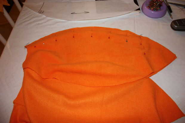 Siguiente, pin dos secciones uno de un lado; Este es el lado que será la máquina coser (sólo este lado).  Una vez que haya completado la Unión de estas dos primeras secciones, añadir otra sección naranja de la misma manera hasta que todas las secciones de un solo color se cosen juntos.  Máquina de coser todas las secciones naranja juntos y coser por separado todas las secciones amarillo juntos de esta manera (éstos se combinarán en un futuro paso).  Se puede utilizar cualquier costura subsidio te como usar alrededor de 5/8" o un poco menos.