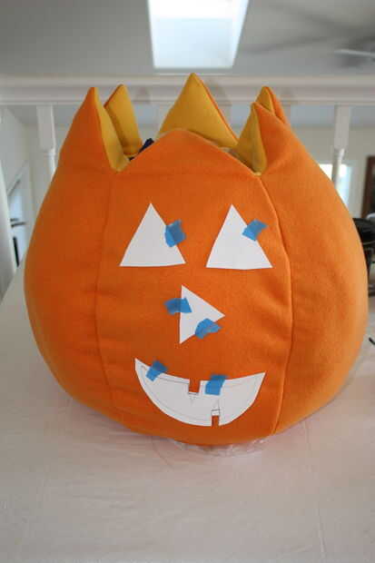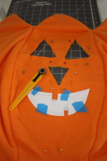 a continuación, dibujar en papel de congelador cualquier cara desea para su jack-o-lantern y recórtalo.  Asegúrese de que encaja en la parte delantera.  Lo hice poniendo una almohadilla o relleno bolsa en medio de la calabaza para darle forma por lo que he podido conseguir una mejor vista.  Luego, con cinta las formas en la parte delantera que desee.  Una vez en su lugar, quite la almohada en el centro y añadir una almohadilla de corte (puede ser uno mismo curativo o no) y una desmalezadora para cortar la cara.  Estará cortando a través de ambas capas del material.  INMEDIATAMENTE pin alrededor de cada sección de la cara para mantener la forma.