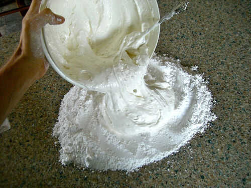 Microondas las melcochas y el agua en un recipiente de cristal removiendo cada 15-30 segundos. Microondas hasta que la mezcla se convierte en suave y se haya derretido. Añadir la mitad de la azúcar en polvo y mezclar para combinar. La Lomita el azúcar restante en una encimera de cocina limpio y volcar la mezcla en el centro. Asegurándose de que sus manos y el fondant está cubierto de azúcar, amasar la mezcla hasta incorporar el azúcar. Añadir en tu sabor favorito y amase para incorporar. Cubrir el fondant en todo momento cuando no esté en uso para evitar que se resequen. Sacar porciones pequeñas en un momento y recuperar el fondant de restante.