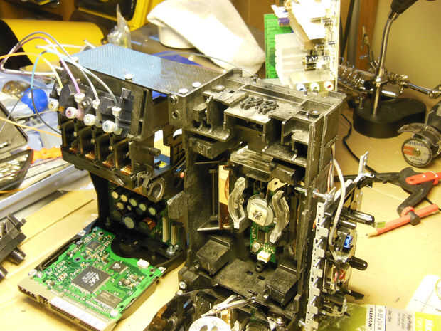 Un buen lugar para empezar a construir un robot de pie es probablemente los pies. Usé dos mitades de un disco duro y las partes de una gran impresora láser para las piernas. Inmediatamente encontré que la parte más difícil de este proceso va a ingeniárselas colocar 2 cosas que nunca fueron pensadas para ser conectados entre sí. Mientras que es posible que suerte de encontrar 2 agujeros esa línea justo donde los necesita, probablemente vas a tener que ser creativo en tus accesorios. Necesitaba una manera de que podría soportar algo de peso y que también me permitiría levantar esta cosa más tarde sin él cayendo a pedazos.