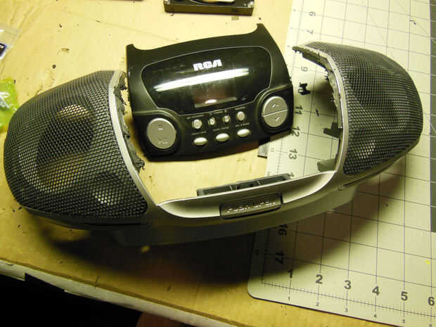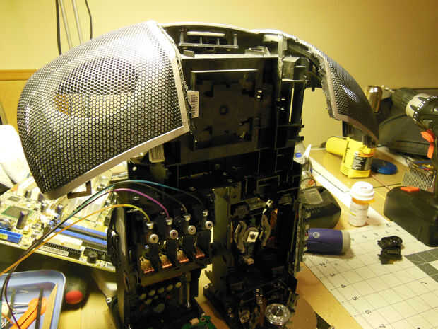 Uno de los mayores desafíos era decidir dónde montar los altavoces. Realmente quería usar como hombros pero no estaba seguro cómo adjuntarlas. Encontré la respuesta accidentalmente mientras cortando el plástico. Ya tenían agujeros para montaje y afortunadamente solo pasó a ser el tamaño perfecto para descansar en la cima de lo ya había construido. Bloquearon acceso a mucho del cuerpo que tendría que estar trabajando, así que ideé una forma para que la Asamblea entera altavoz hombro voltee hacia arriba y hacia abajo mediante la construcción de algunas piezas de encargo en la impresora 3D.