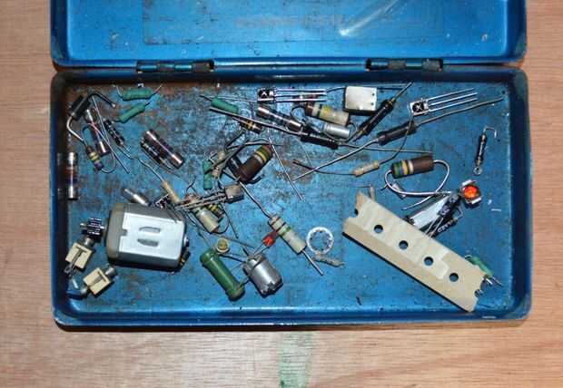 1. basura! Cualquier vieja basura realmente. Mis cosas favoritas para usar son viejos repuestos como motores, condensadores y resistencias vintage. Todas estas cosas se pueden sacar de la vendimia electrónica.
