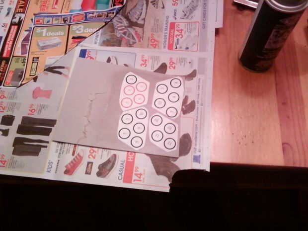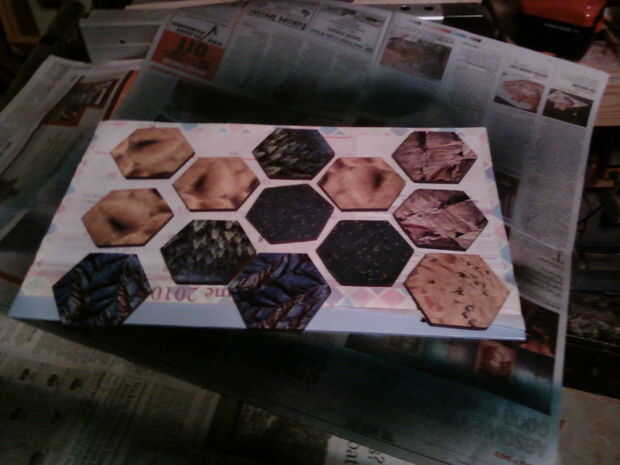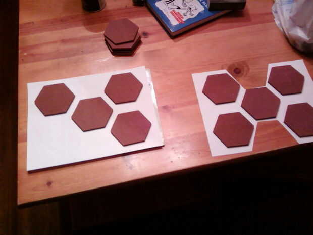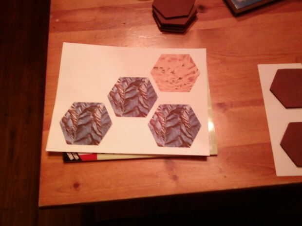Entonces utilicé spray adheasive para pegar las piezas hexagonales en la parte posterior de la impresión con el lado liso de la madera prensada contra el papel, cortado y ajustado al borde de la Junta y rociado con pintura en aerosol para sellar la parte superior claro.