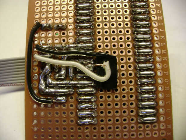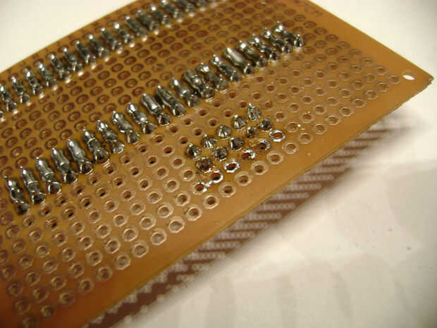 Soldar la cabecera macho 10 pines la placa de circuito y conectarlo al microcontrolador femenino encabezado con puentes de soldadura y los cables siguiendo la hoja de datos de tu microcontrolador.