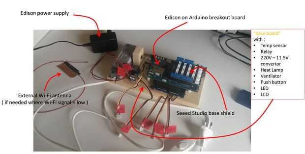 En este sistema una lámpara de calor imita el HVAC en modo de calefacción y un ventilador del ventilador es HVAC en modo de enfriamiento. La lámpara enciende calentando el sensor de temperatura y cuando alcanza el límite de umbral, un comando de la nube de la lámpara se apaga y se enciende el ventilador hasta que la temperatura descienda por debajo del umbral. Por lo tanto el centro de control principal que impulsa el sistema de climatización está en la nube donde el umbral límites pueden cambiar en lo. El ventilador puede controlarse también manualmente con un botón en el tablero para encender y apagar. El programa de esbozo se escribirá en JavaScript * utilizando el entorno de desarrollo de Intel® XDK IoT Edition. Para obtener más información en el tablero de Edison de Intel® y Intel® XDK Descargar: https://www-ssl.intel.com/content/www/us/en/do-it-yourself/edison.html