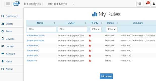 Ahora estás listo para crear las reglas para activar los comandos. Haga clic en reglas en el menú lateral para abrir la ventana de mis reglas que muestra los controles activos y archivados para la demo en la placa Intel® Edison. Va a crear dos reglas, una para cuando la temperatura es inferior a 30° C envía una notificación a la Junta diciéndole que gire el ventilador apagado y la lámpara de calor en. Y una segunda regla para cuando la temperatura se eleva por encima de 40° C, envía una notificación para encender el ventilador y la lámpara de calor apagado.