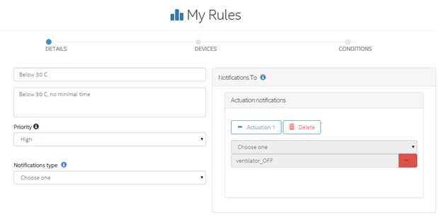 Para crear la por debajo de 30° C de la regla, haga clic en agregar una regla. Darle un nombre, descripción, prioridad y elegir el tipo de notificación de la actuación. Elegir la actuación de ventilator_OFF. Haga clic en siguiente y seleccione el dispositivo Intel® Edison. Haga clic en siguiente otra vez y revise habilitar reinicio automático, elija la temperatura medida el' seguimiento' y ' gatillo cuando ' la condición básica se establece en < 30. A continuación, haga clic en hecho. Repita para la regla anterior de 40° C pero enviar la actuación ventilator_ON y elegir > 40 para el 'gatillo Cuándo.'
