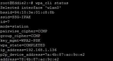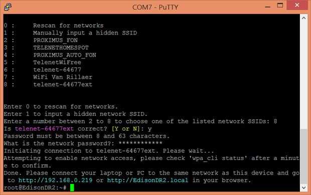 Puede confirmar esto por ir a la dirección ip http://'Edison desde el navegador en su ordenador mientras el ordenador está en la misma red. O escriba en estado wpa_cli en la ventana de serial y asegúrese de que wpa_state se termina y hay una dirección IP asignada.