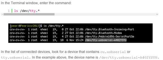 a. Abra una ventana de terminal (para encontrar uno, usar Spotlight para buscar 'terminal') e introduzca el comando ls /dev/tty.* para identificar el nombre de puerto serie USB.