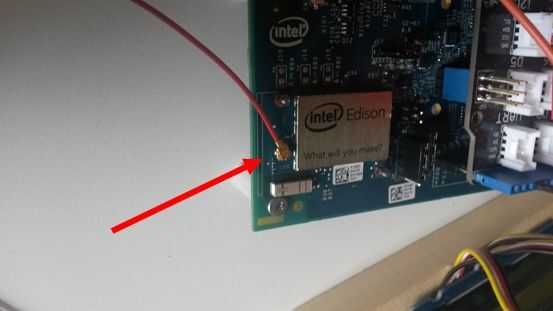Si la señal Wi-Fi es débil o bajo, conecte la antena externa para la placa Intel® Edison como se muestra a continuación.